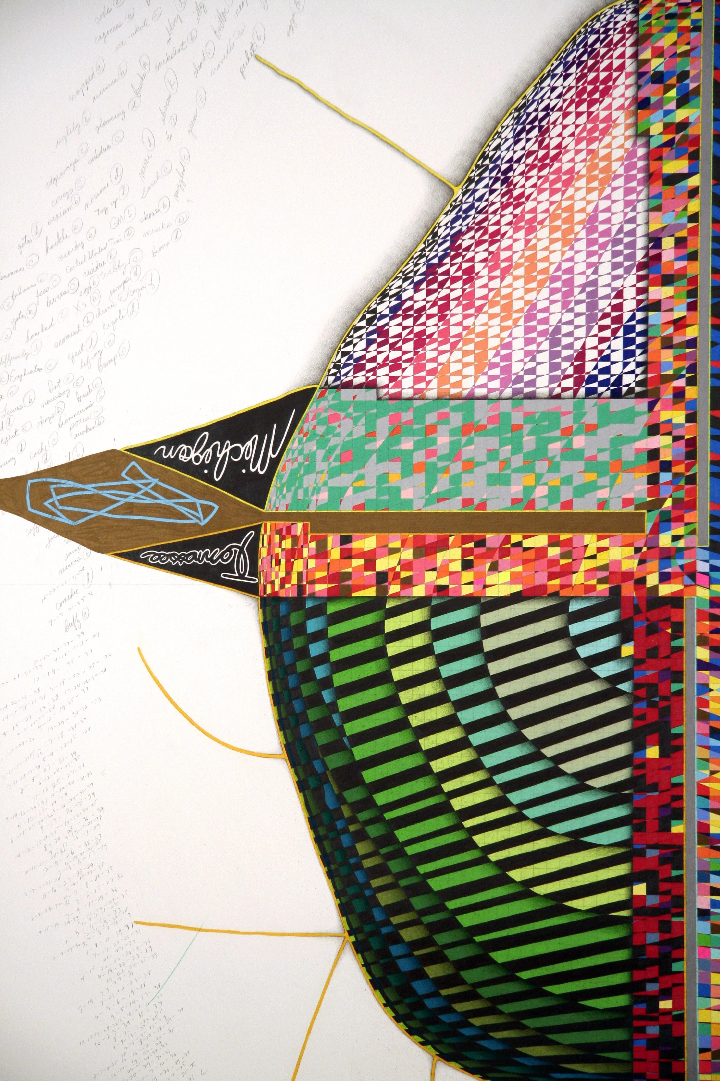 What would winning the lottery feel like? I began this work by sketching and gridding out the main oval shape. I then compiled the winning lottery numbers for the past year’s worth of games from different states across the country. I started with the NY State Lottery and used the last set of 5 winning numbers to generate a new zip code, which then led me to another state. I compiled the winning numbers from that state, and again used the last 5 numbers to generate a new zip code. I continued this until the drawing was finished. To form the central shape’s patterns, I created different color-based “codes” as a way to represent the numbers visually. I changed the color system as the pattern reached the center, creating a strata-like progression in visual complexity – for the outer layer, each color denotes a specific number, while for the innermost layer, colors only signify even or odd numbers. Simultaneously, I translated these same numbers into words. I set up a text-based encoding system based on the alphabet’s numerical equivalents (a=1, b=2, etc.). As each winning set of numbers generated a random set of letters, I then entered these random letters into a pocket dictionary, which searched for the closest approximated word. I then wrote these words around the central form, creating a (sort of) hand-written halo.