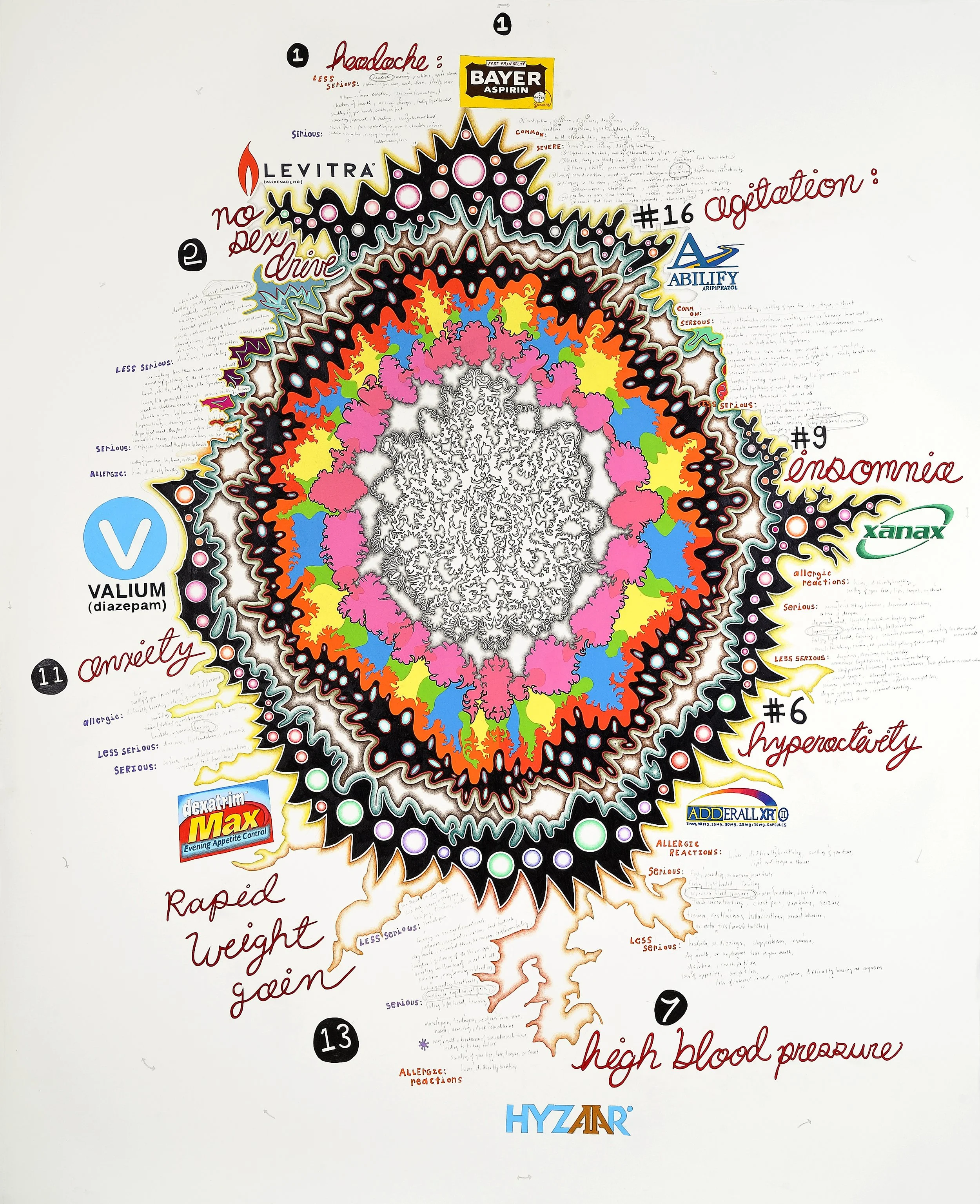 "O’Connor develops his new works through a circular, or looping, process of one thing leading to another, and back to the beginning. His most recent and largest drawing, “Drug Loop,” reveals the circular effect of popular medications and their side effects. He begins at the top with “headache” and takes as solution, Bayer Aspirin. He then randomly selects from among listed side effects, chooses a new medication to treat the side effect, and so on around a central circular shape-from “no sex drive” to “hyperactivity,” “anxiety,” and, finally, “agitation.” - Susan Swenson (2011) In the center of the drawing, I began by drawing 2 small brain scans, connected - one of a healthy brain, and one with Alzheimer's disease. I then traced the contour of the 2 brains combined, flipped it, and redrew it around the first images. I continued this process of drawing and re-drawing the contours of each successive form, allowing the shape to grow organically, with small, almost imperceptible changes occurring with each phase. It was as if the specific shape of the original scans began to multiply and mutate, almost fractally, and eventually started to invade the medication ring.