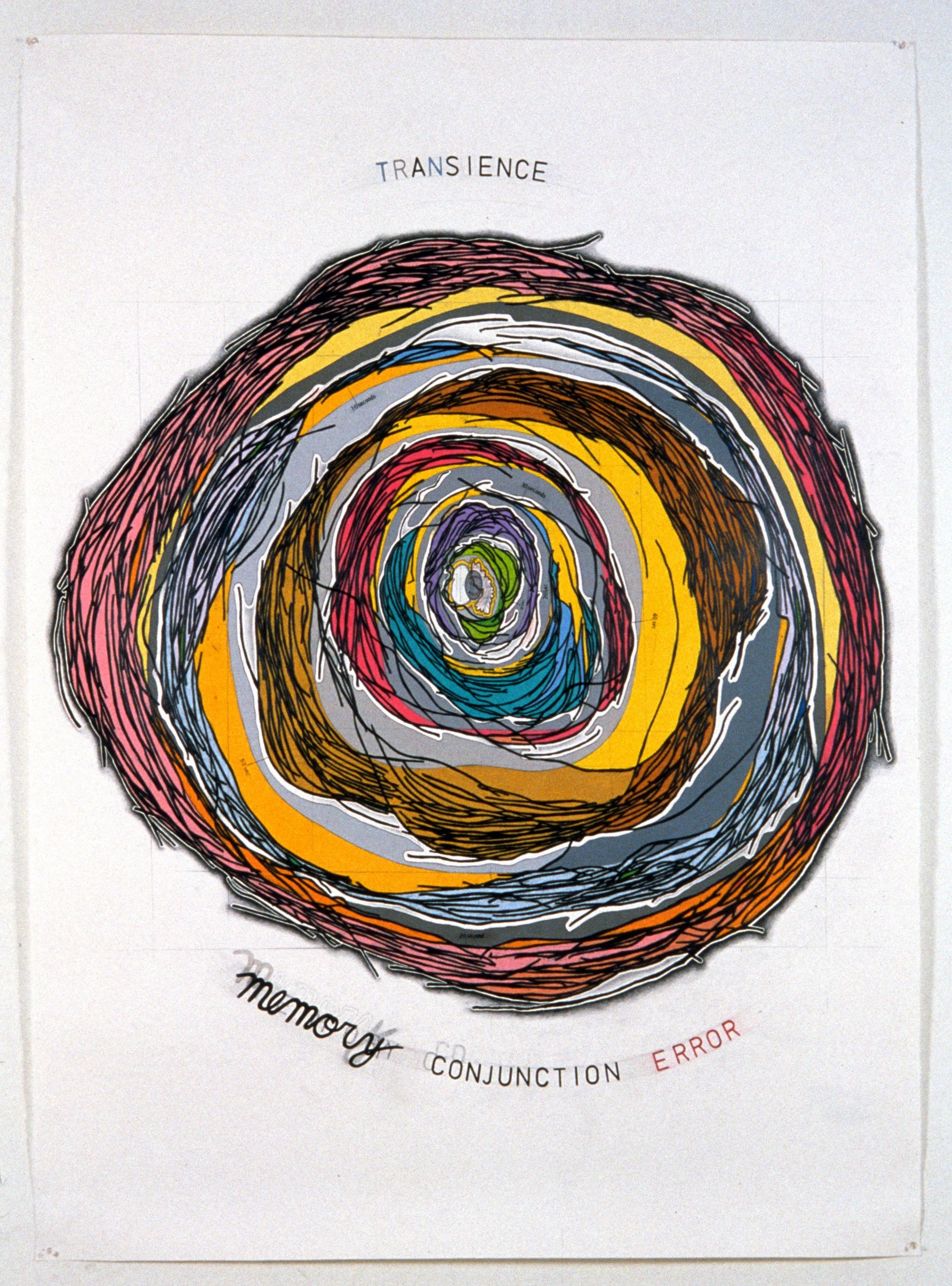I was inspired to make this drawing by the theories of the German 19th-century scientist Hermann Ebbinghaus. He quantified transience. His theory was that memory of random or impersonal "things" fades over time at predictable rates. I decided to test this theory on myself, visually. In the drawing, I began with an all-over, numbered grid. Using sets of lottery numbers applied to the grid, I created an initial shape. I then tried to test my memory of this chance-derived form. To do this, I stood at arms’ length, closed my eyes, and attempted to redraw the shape, section by section. This process eventually resulted in the final, more complex form. The patterns and information included in and around the form reflect the history of the drawing in addition to my conceptual and aesthetic decision-making.