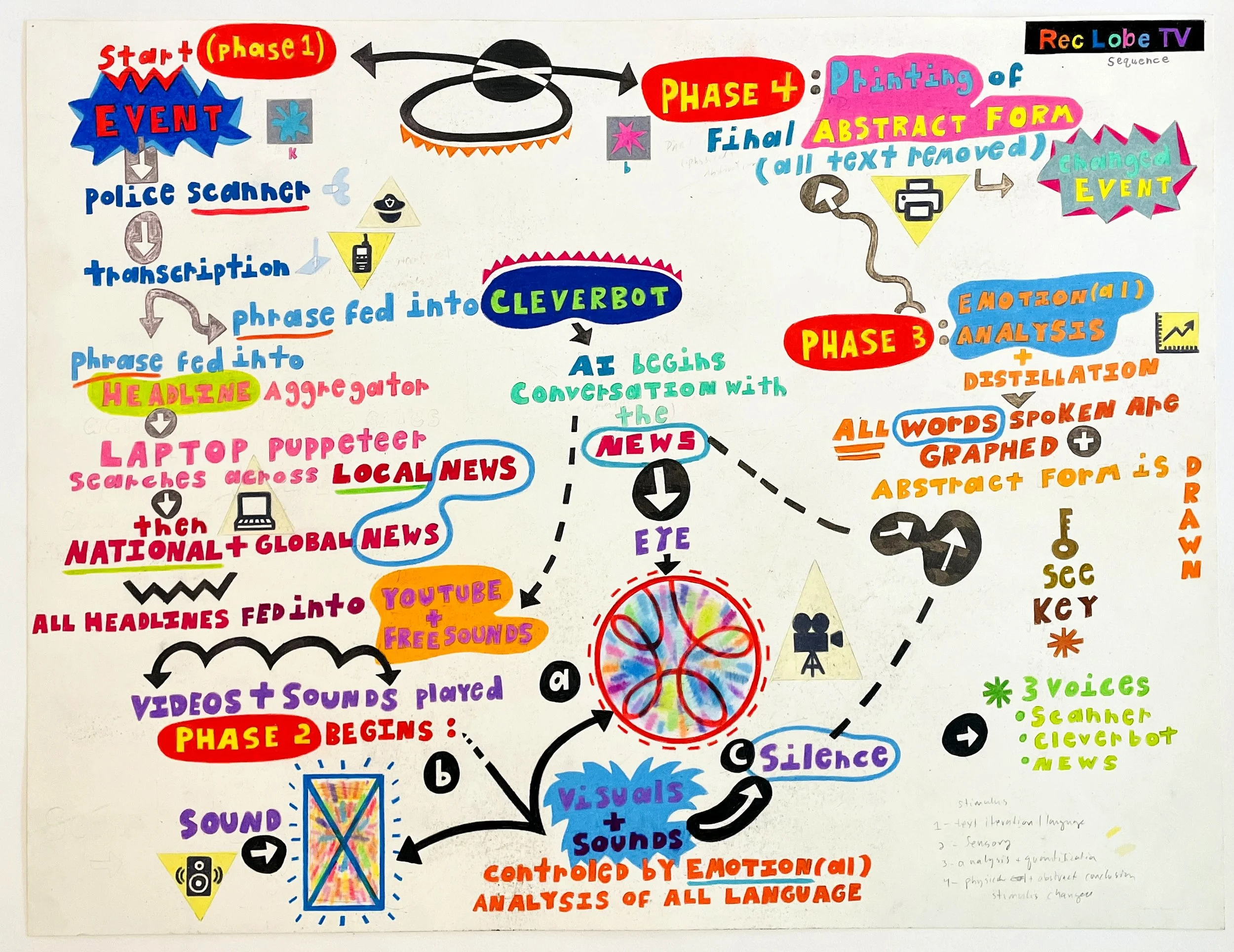 CONCEPT>> Rec Lobe TV maps the labyrinthine processes through which human experience is perceived and transformed - from observation through language - into a multi-sensory simulacrum that affects consequent behavior and beliefs. RLTV follows this chain reaction step-by-step, rendering the results visible, no matter how bizarre: from real-time accounts of local events and national news reporting, into the untethered time-space of the internet and AI intelligence. Like mapping a complex, multi-directional game of telephone, RLTV mirrors the process by which we come to believe what’s real in the world, as direct observation of a singular phenomenon mutates through law enforcement, media, AI, stochastic stimuli, and storytelling into eerily uncanny phenomena. Like Joseph Heller wrote in Catch-22, “Just because you’re paranoid, doesn't mean they aren’t after you.”
