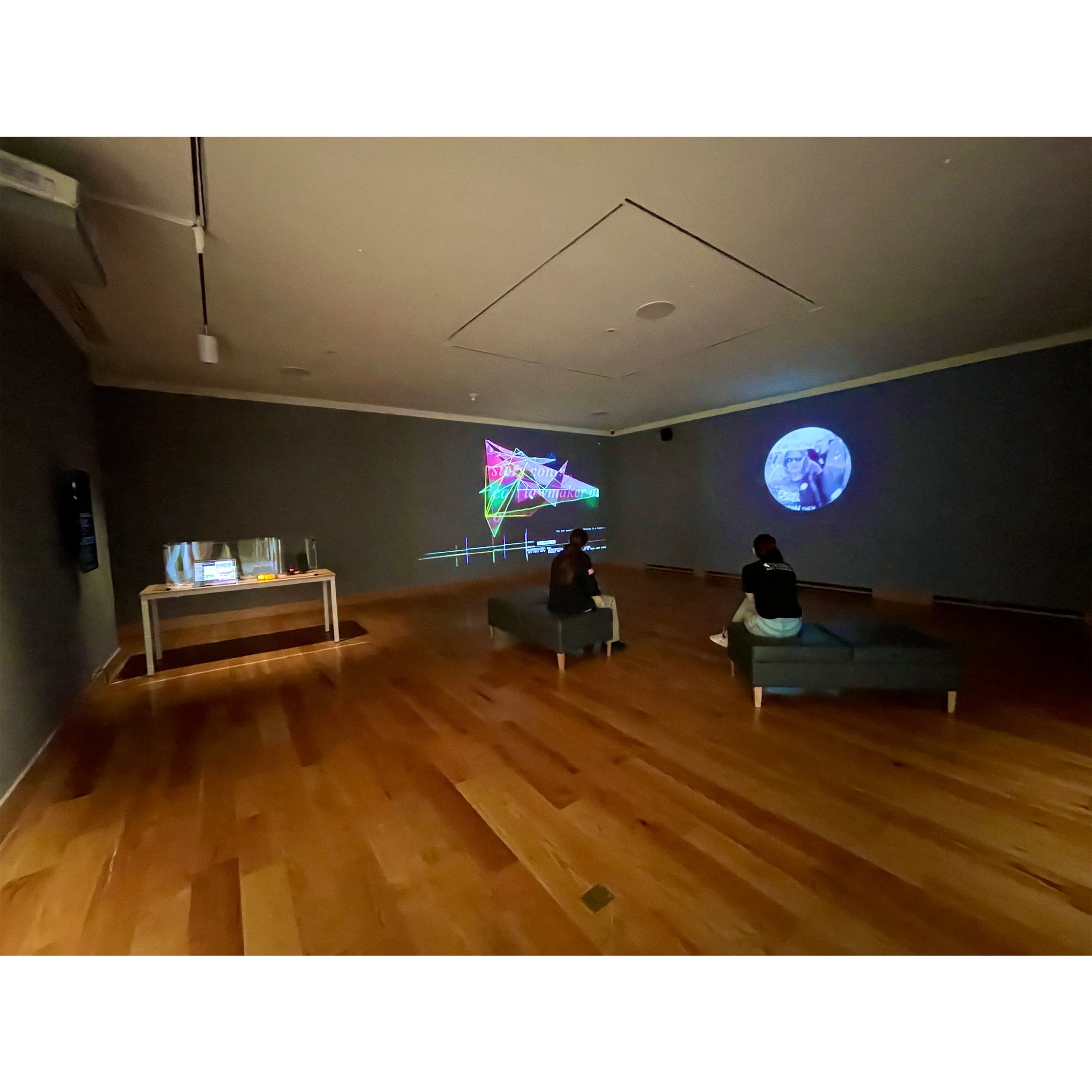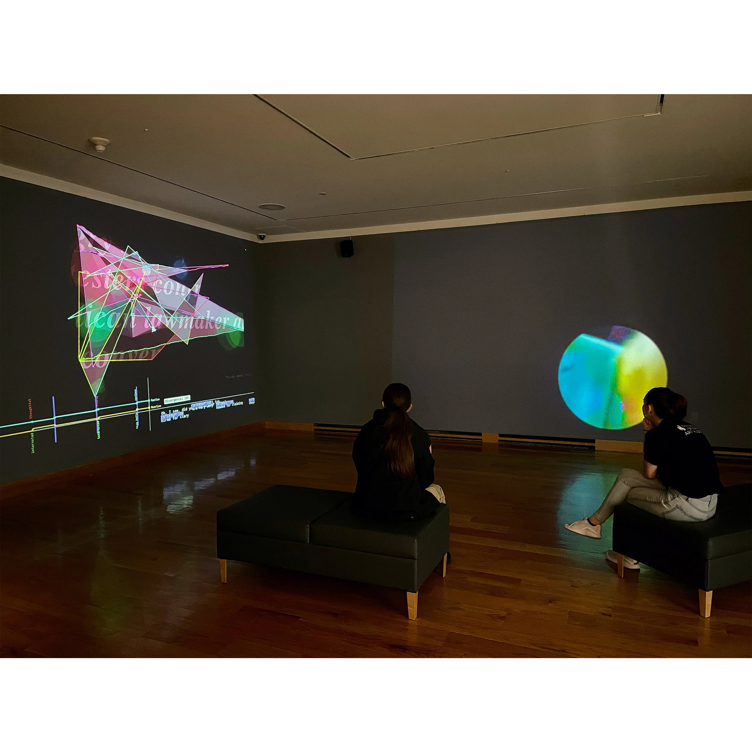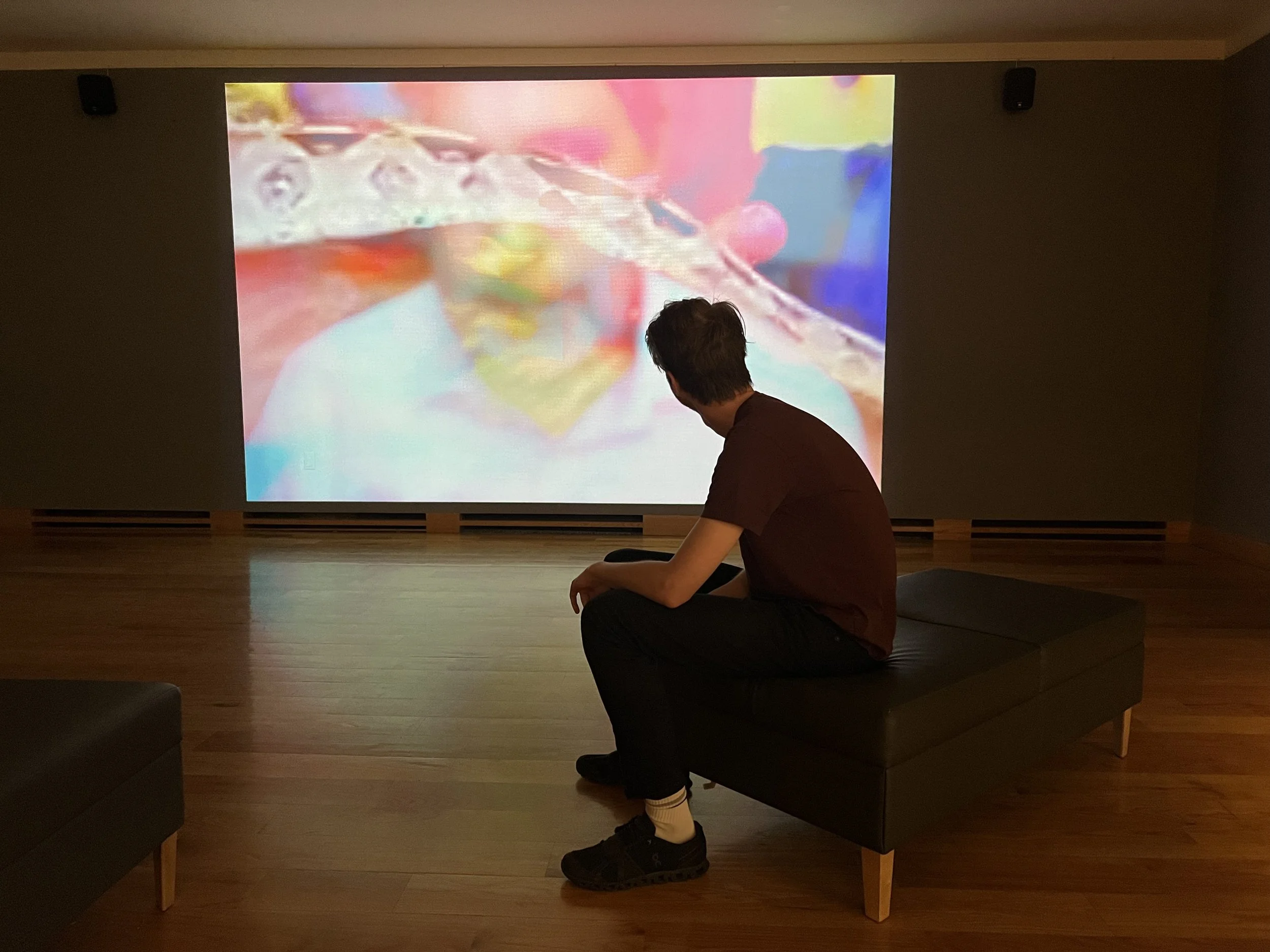 The scale of the projection is cinematic and bodily, feeling like a movie or film, which dwarfs the human body. As each video ends, the next video will play, pulling the project / sequence down the rabbit hole. This is not unlike how someone might find conspiracy theory videos after watching videos of games or the news.