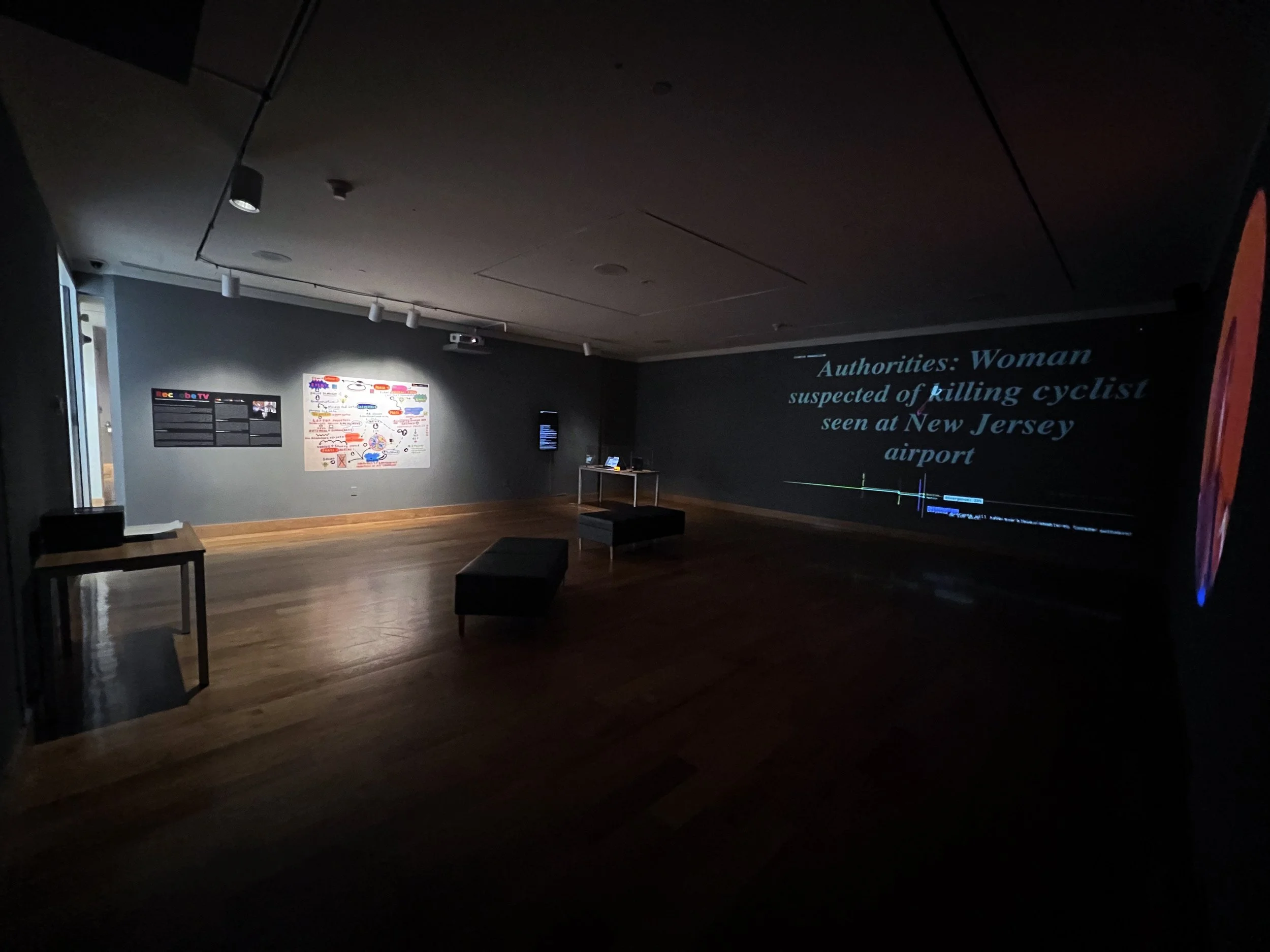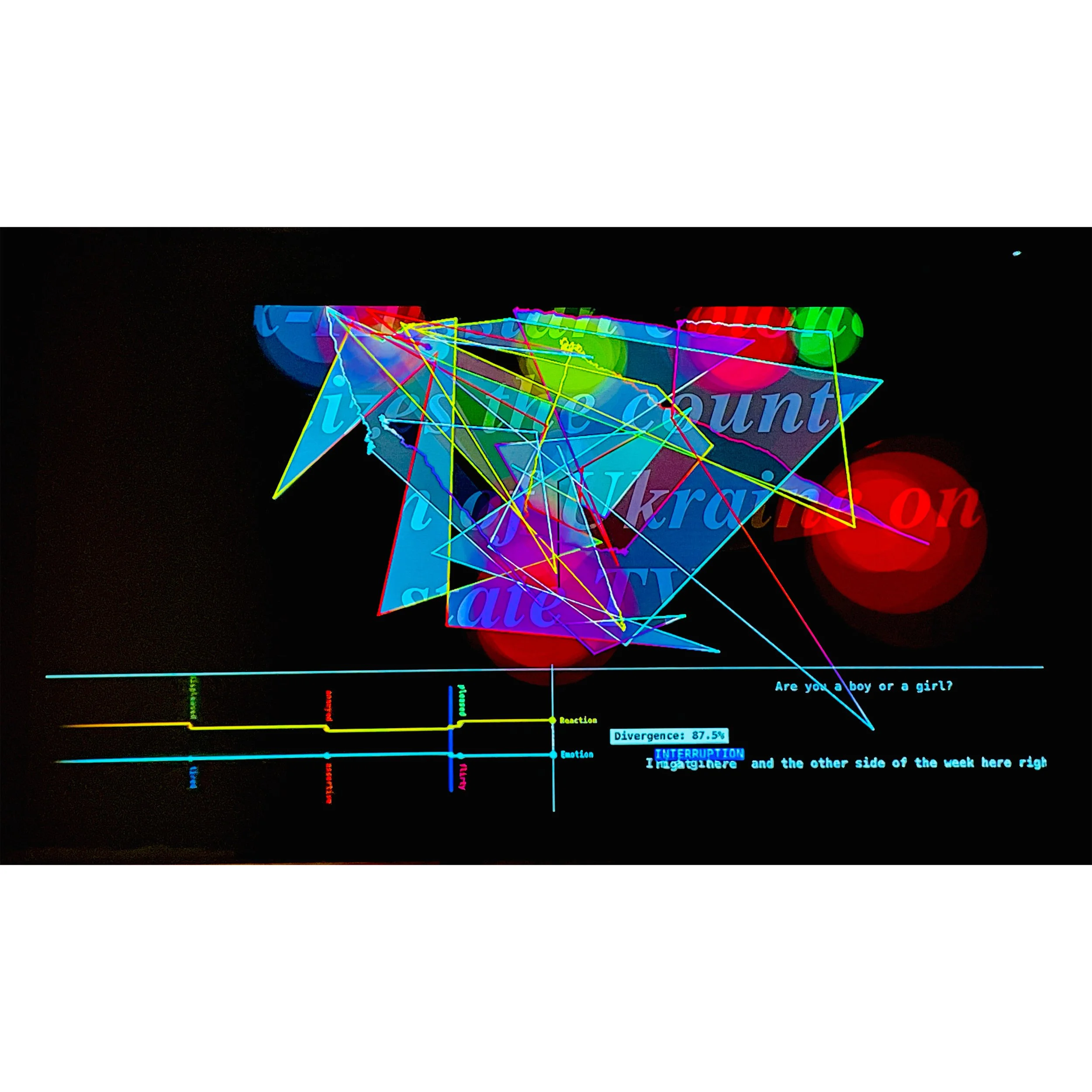 PRESS RELEASE EXCERPT>> Bringing together real time events, collaged footage, global patterns of journalistic story-telling, chatbot AI, and appropriated human commentary, Rec Lobe TV portrays several ‘intelligences’ attempting to make sense of each other and the world at large. In ways both fascinating and terrifying, the slippages that perpetually dislodge any emergent logic send us down the rabbit hole. Each output (projection, graphs, media, web browsing) represents a specific method through which we, as human beings, attempt to understand the world via the media around us, and, simultaneously, how these same media cycles can confuse, obfuscate, and ultimately cause us to lose our senses of self. While there are parameters within which RLTV operates, our collective forfeits a significant degree of agency to the system we create, embracing the unpredictable at each step, as the moment-to-moment outcome cannot be anticipated. Simultaneously humanistic and technological, Rec LobeTV advances our investigation of the uncanny entities that shape our lives.