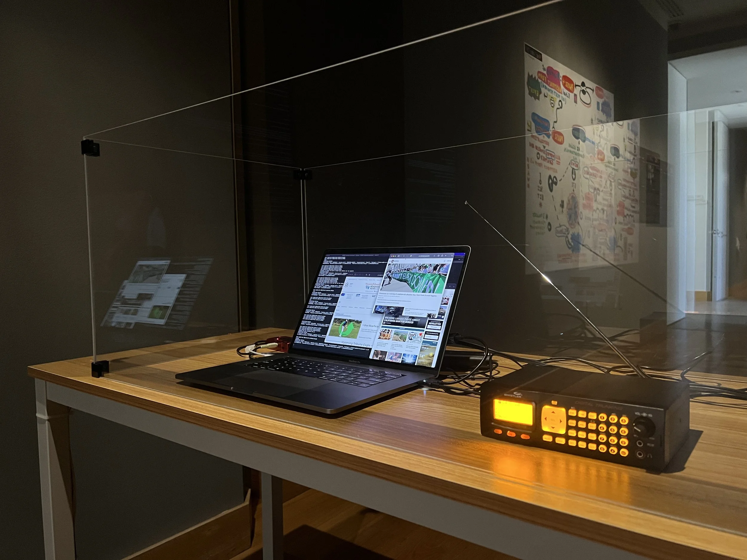 Materials: Police Scanner, Projection, Laptop, Speakers, Sound, Printer, Printouts