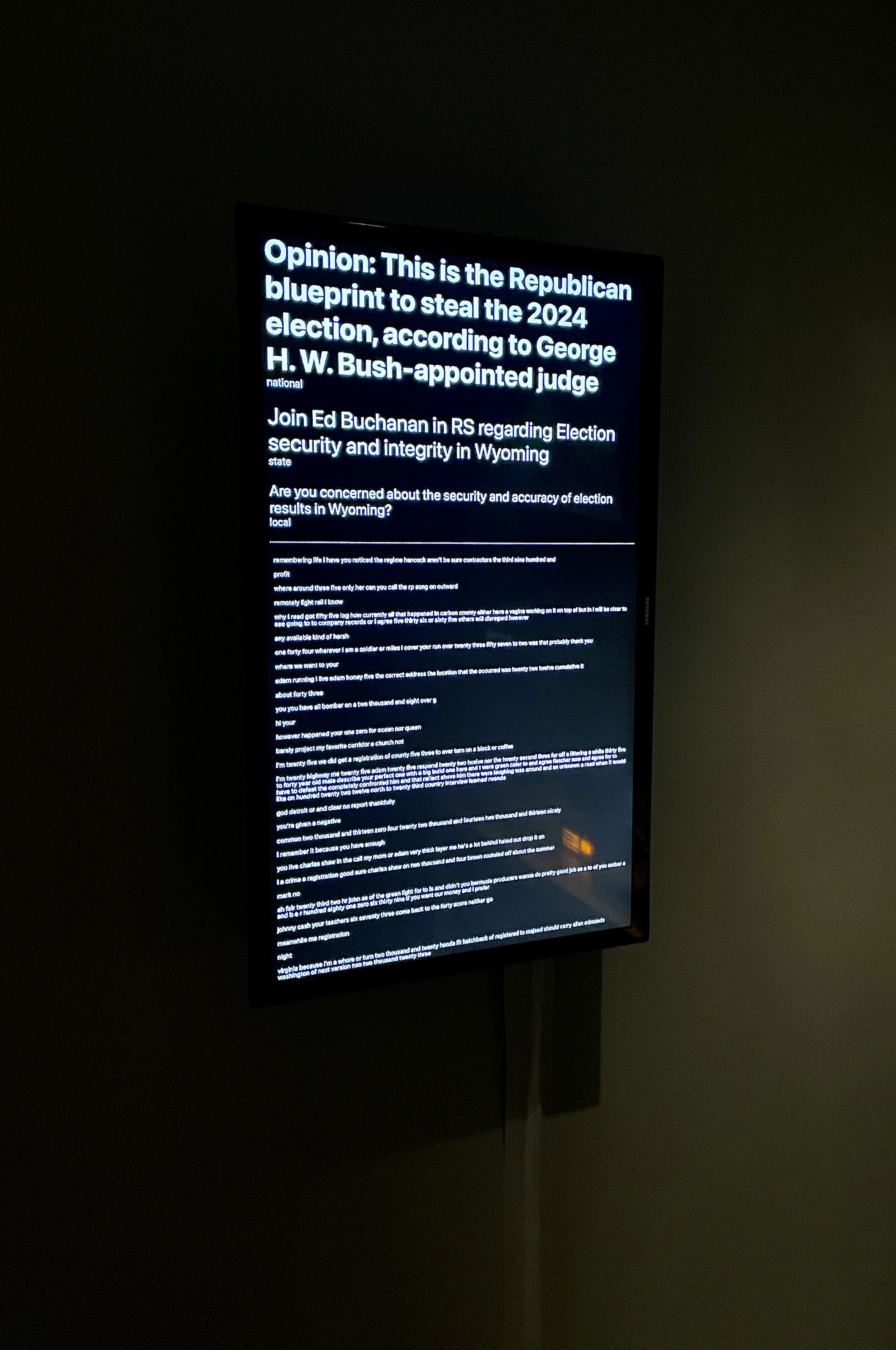 A laptop’s scale is human and familiar, and its screen is our most commonly used window into the virtual world. RLTV’s laptop displays various aspects of the project's machinations: data input, transcription feed, automatically updated news pages. Visitors can see our project “think,” so to speak, on the laptop.