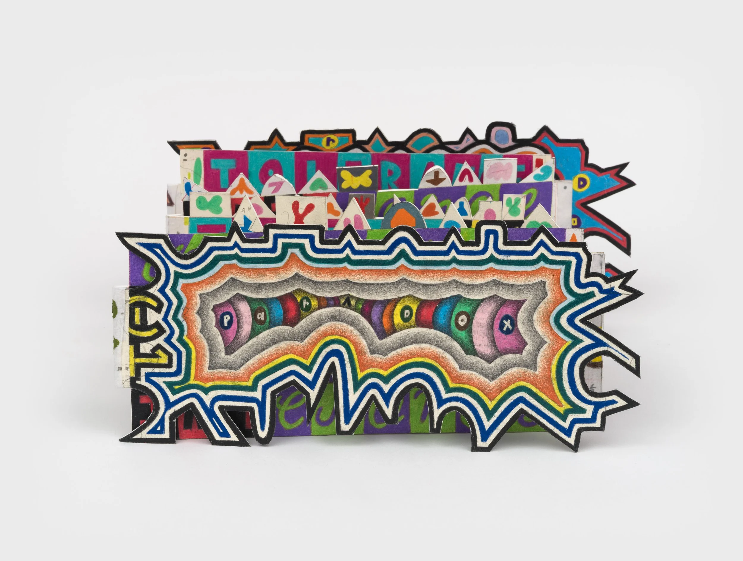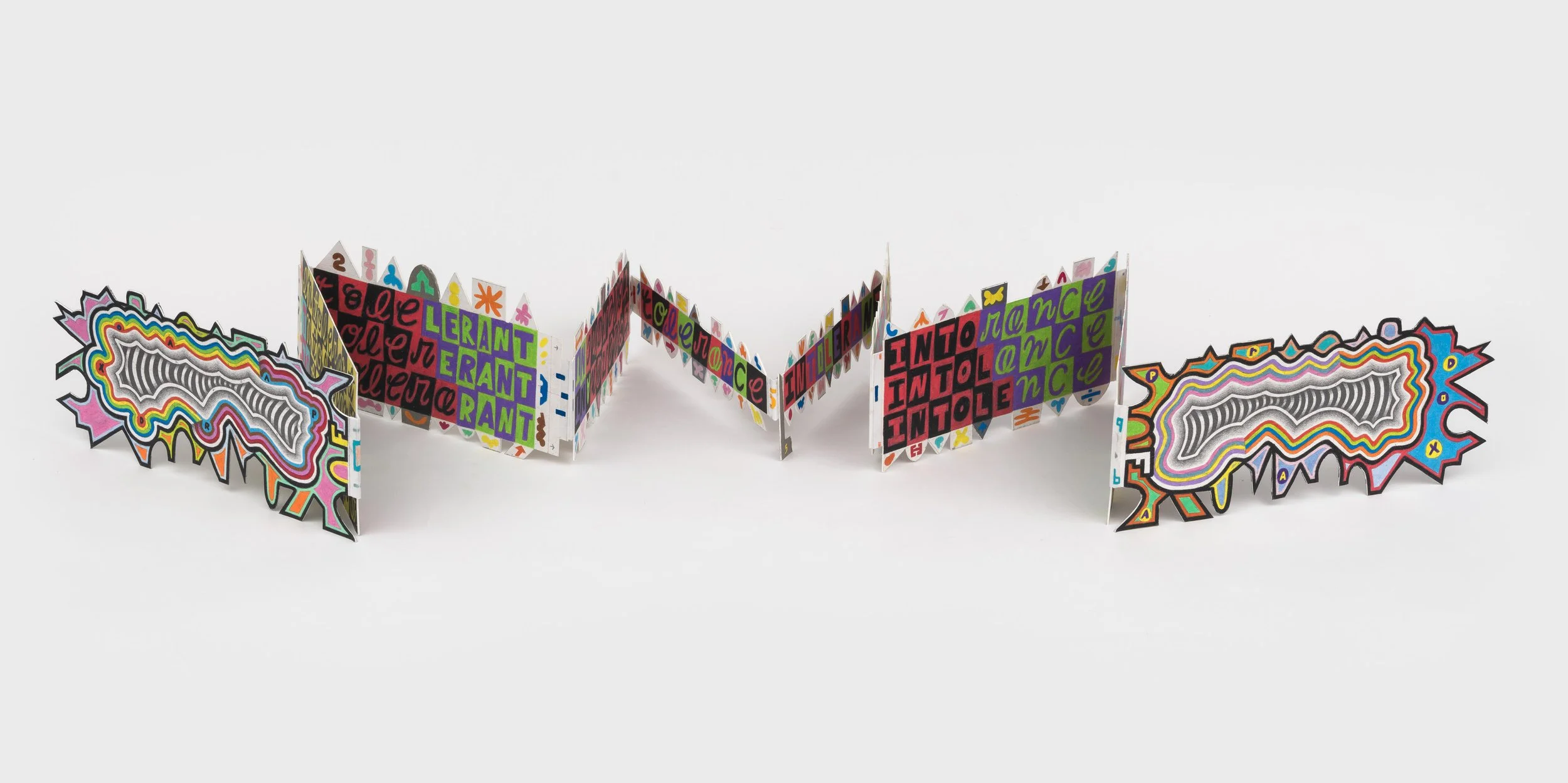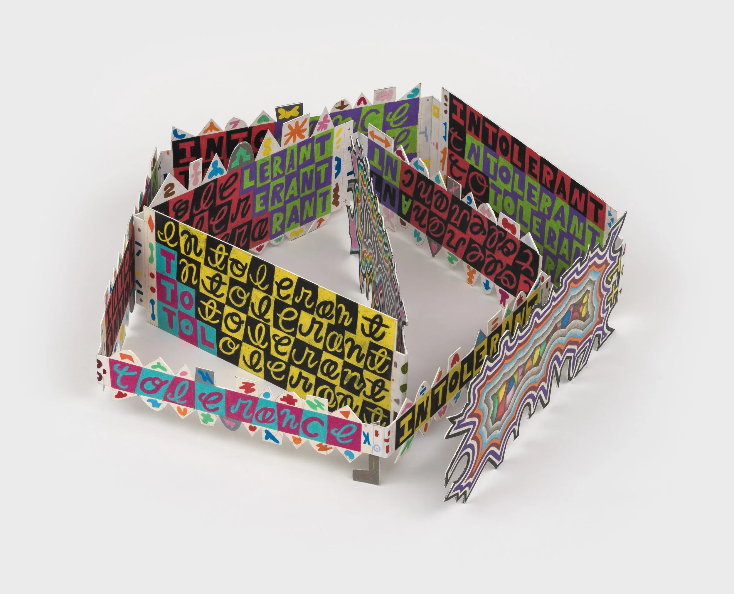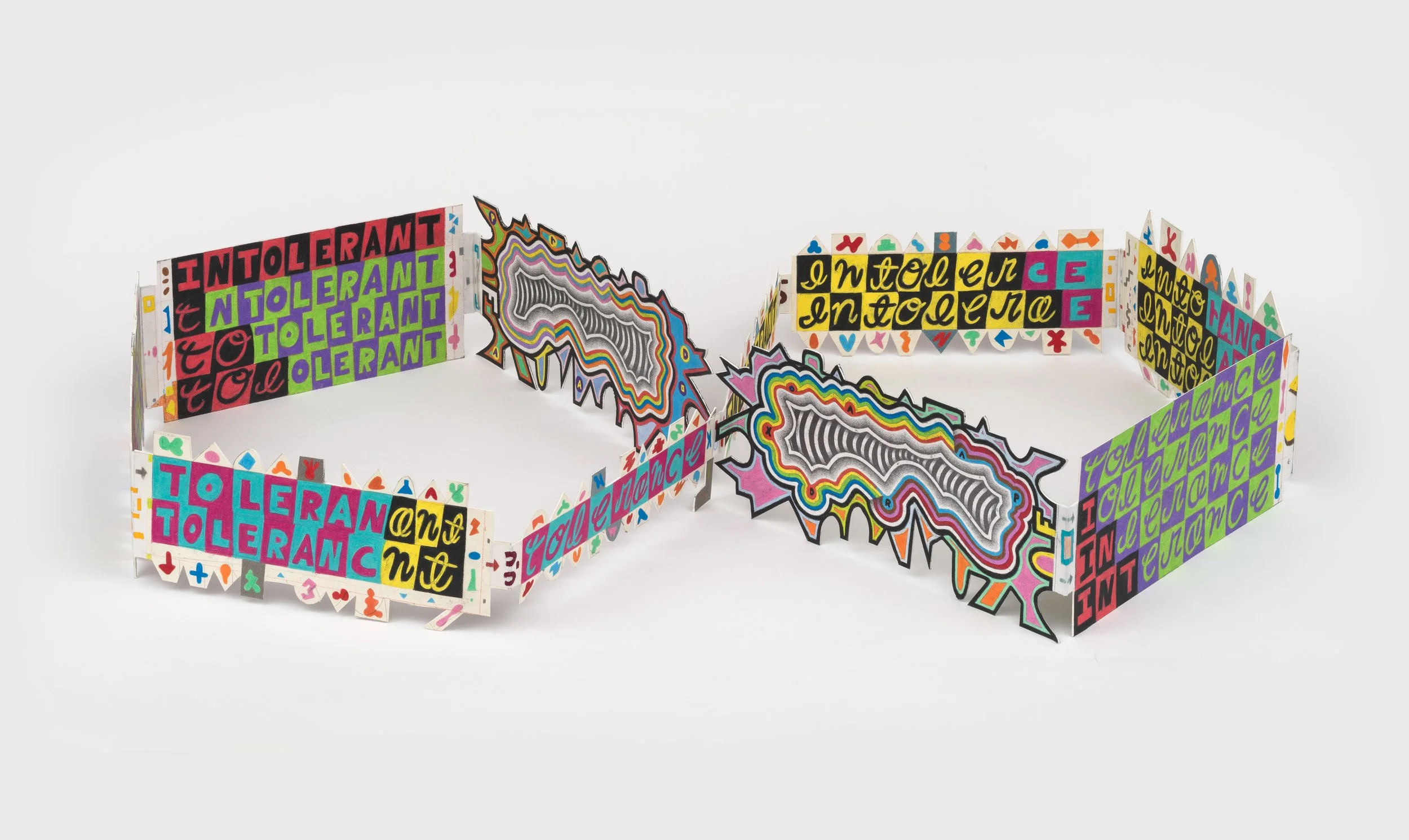 Within this artist book, I transposed the intrinsic contradiction of the Paradox of Tolerance through a process of linguistic and graphic morphing, a gradual and incremental displacement of one word by another through sequential letter substitutions, positional shifts, and visual transformations. Moving from left to right and front to back, the letters, colors, and relative positions of the words TOLERANCE and INTOLERANCE progressively exchanged places, structurally enacting the Paradox of Tolerance: the idea that when tolerance is extended to the intolerant, it risks enabling intolerance to dominate, thereby eroding the very principle it depends on. Each word eventually occupied the other’s position, then returned to its origin, only to begin morphing again in an endless loop.
