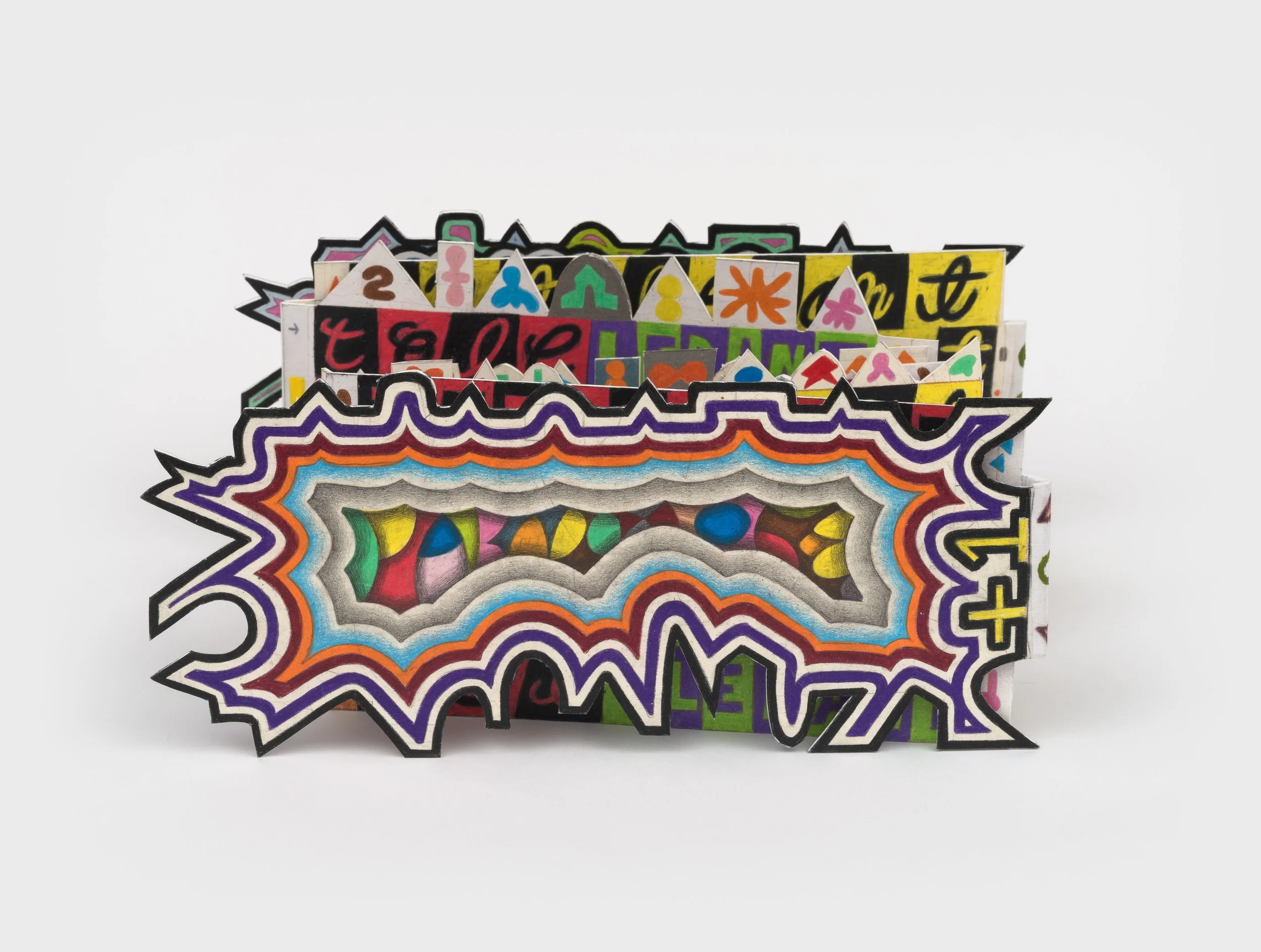 Its structure was deliberately mutable, lacking a definitive beginning or end. Colors alternated and shifted in sync with the letters, reinforcing the cyclical nature of ideological struggle. When unfolded or rearranged, the book could be read linearly or as a continuous loop, like a Möbius strip or infinity symbol, a recursive cycle of opposing beliefs. The cover, traced from the book’s closed outline, compressed its interior into a mirrored silhouette, turning contradiction into sculptural form.